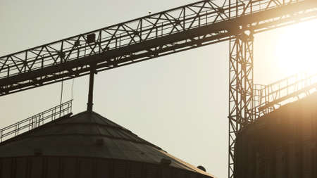Agriculture facility bin tank and frame girder construction. Sunshine at the evening.