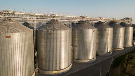 Row of granaries for storing wheat and other cereal grains. Set of storage tanks cultivated agricultural crops processing plant.
