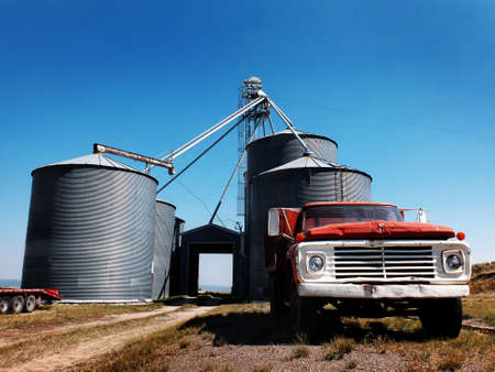 Old red work truck parked in front of several large steel grain silos on farm