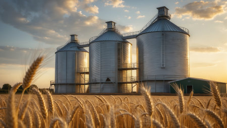 Grain silos surrounded by a ripe wheat field during sunset. The warm sunlight highlights the metallic silos and creates a serene rural atmosphere.