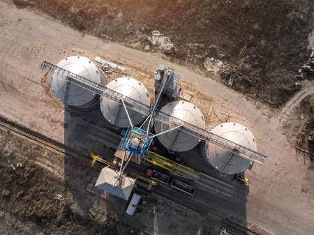 Grain storage in large silos aerial view. Silo with grain. Grain storage tank view from above