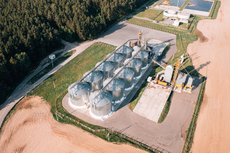 Generative AI silver silos on agro manufacturing plant for processing drying cleaning and storage of agricultural products, flour, cereals and grain.