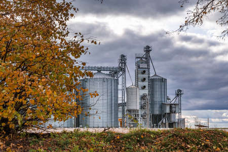 Autumn landscape of grain silos in a farmer's field.