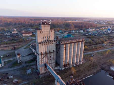 Golyshmanovo, Russia - May 6, 2021: Aerial view on grain elevator in the evening