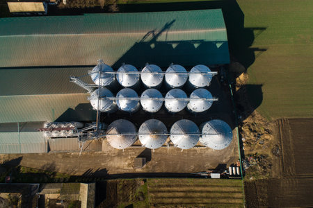 Grain Silos granary. Top down shot. Aerial drone shot of stainless silos for storing crops.