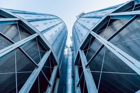 Agricultural silos. Storage and drying of grains, wheat, corn, soy, sunflower. Industrial building exterior. Big metallic silver containers close-up. Background of agricultural tanks with copy space.