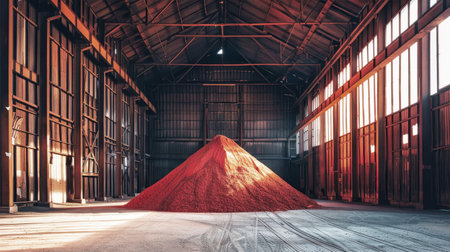 A vibrant pile of red sand stands out in a sprawling warehouse filled with potash fertilizers. The sand glows like embers in the dimly lit space.