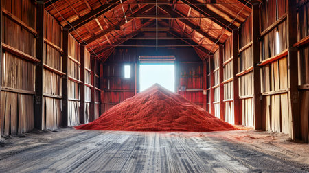 A mound of vibrant red sand spills out across the floor of a barn full of potash fertilizers, symbolizing the mining and processing of minerals.