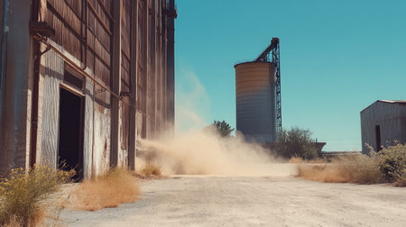 Captivating image showcasing a dusty industrial environment with abandoned structures and grain silos under a clear blue sky, reflecting rural decay and agricultural themes.