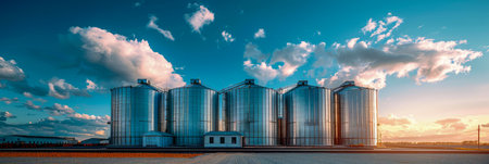 Majestic Sunset Silhouettes Industrial Grain Silos in a Rural Landscape.