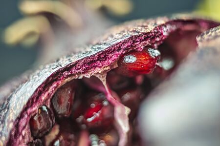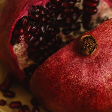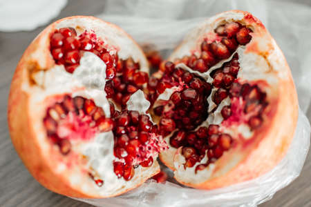 Red juicy pomegranate seeds close-up. Halves of ripe broken pomegranate fruit. Selective focus.