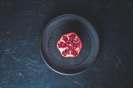 Fresh juicy pomegranate - whole and cut on a black vintage background, top view, horizontal, with copy space