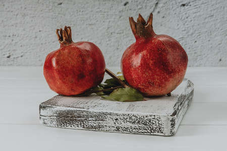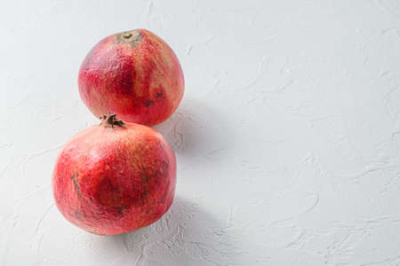 Fresh pair of pomegranate over white concrete background, side view space for text