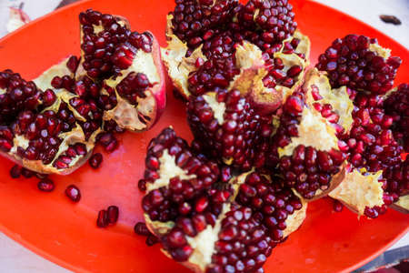 pomegranate on a red plate on a table. partial view. antioxidant food for longevity and heart health. vegan food.
