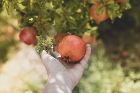 Person's hand holding a ripe pomegranate fruit hanging on a tree.