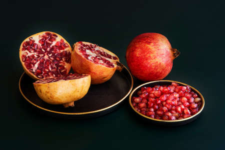 Still life. Juicy ripe opened pomegranate fruit with seeds close up