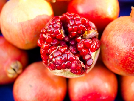 Open frash pomegranate on a wooden desk, pomegranates in the background.