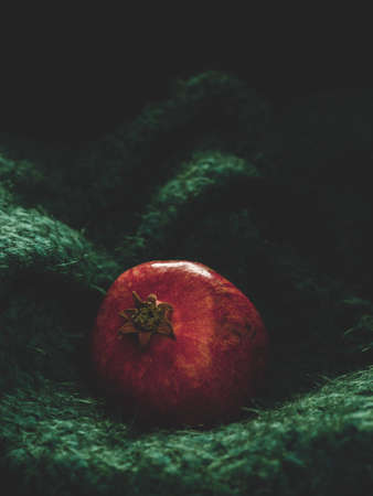 Open grenade lies against a black background. red grains glisten. dark-key macro photography