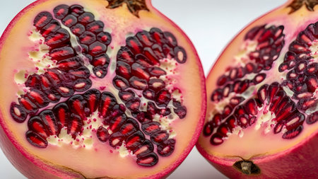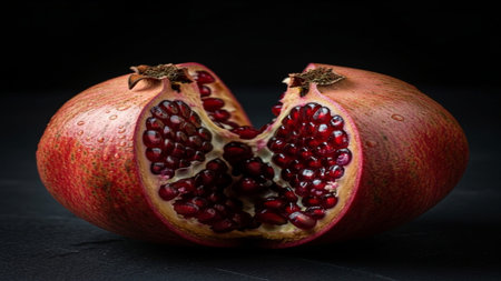 A close-up view of a pomegranate cut in half, revealing the vibrant red arils packed inside. The juicy texture and intricate arrangement of the seeds highlight the freshness and nutritional value of the fruit.