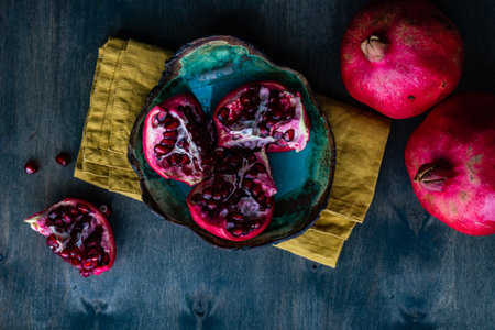 Pomegranate on blue wooden background