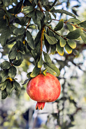 Pomegranate hanging on a tree branch in the garden. Raw antioxidant food. Colorful image.