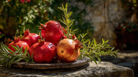 A stunning arrangement of fresh pomegranates highlighted by vibrant red hues and lush greenery, set on a rustic stone surface under natural light.