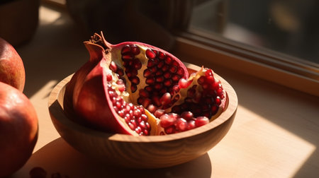 Close-up of a halved fresh pomegranate with vibrant red seeds on a rustic wooden surface. High detail and vibrant contrast.