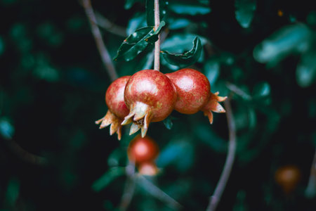 A macro shot of pomegranates on the branch