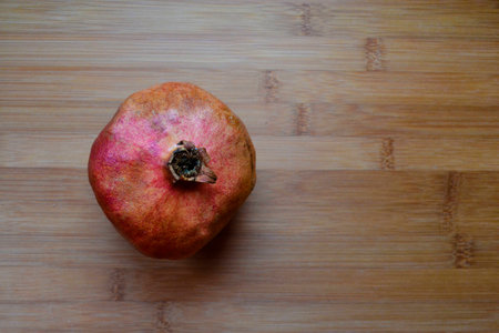 Ripe organic pomegranate fruit on rustic wooden table with copyspace
