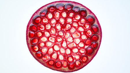Pomegranate. Open fruit with glistening ruby red arils on a white surface, captured in soft natural light