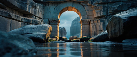 Ancient stone archway illuminated by soft light, opening to a tranquil rocky landscape with water reflections. Twilight ambiance enhances the mystical atmosphere.