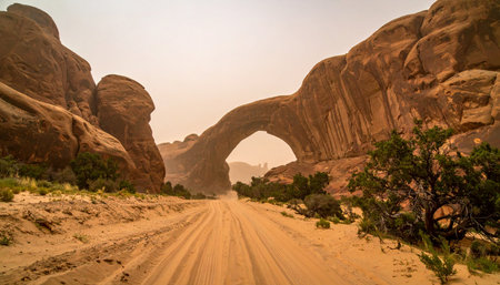 Embark on an off-road adventure down a dusty desert trail, with a magnificent natural stone arch looming in the distance.