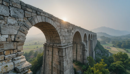 Roman aqueduct's network of stone channels and arches water in scenic countryside