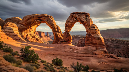 Delicate Arch at sunset, Utah, USA. Natural sandstone formation, golden light.