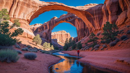 Hiker exploring a scenic desert canyon with a creek flowing under a magnificent double arch. Ai generated image