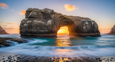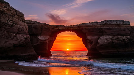 An impressive natural rock arch frames the vibrant sunset. The composition features the ocean waves and the striking contrast between the dark rock and the vivid orange and red hues of the sky. This image may be used for various commercial or editorial purposes.