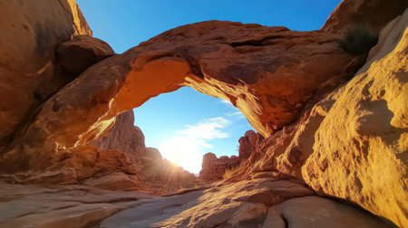 The morning sun bursts through a magnificent natural sandstone arch in the heart of Utahs desert. This iconic rock formation, sculpted by millennia of wind and weather, stands as a powerful testament to the beauty and endurance of nature, inviting adventurers to explore its grandeur.