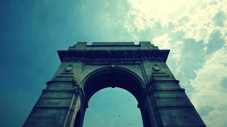 The majestic India Gate rising into a blue sky, framed by an open foreground with ample space for copy