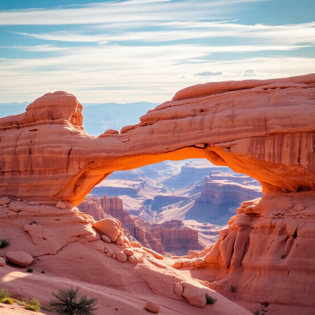 A striking natural sandstone arch frames a sunlit canyon, showcasing rugged desert landscape and vibrant rock formations.