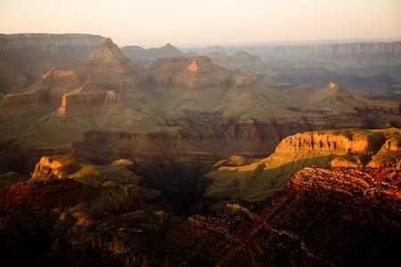 Sunrise over the Grand Canyon, on an early August Morning. The rising sun is casting long dramatic shadows over the Red Rocks of the Canyon. Grand Canyon National Park, Arizona, USA.