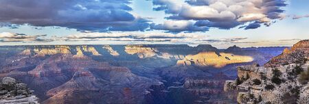 An evening winter panorama of the Grand Canyon with snow in the high elevation and dramatic sunlight and shadows being cast into the canyon.