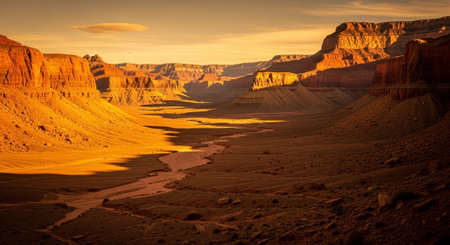 Golden light bathes the Grand Canyon at dusk, creating a breathtaking view of the rugged terrain.