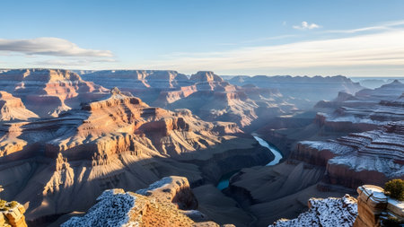 Majestic grand canyon vista with snow-dusted edges and the winding colorado river under a clear sky