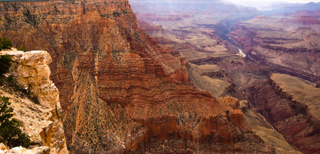 Panorama of the Grand Canyon Puff red rocky slopes on the background of the cleft, where flows with a meandering river