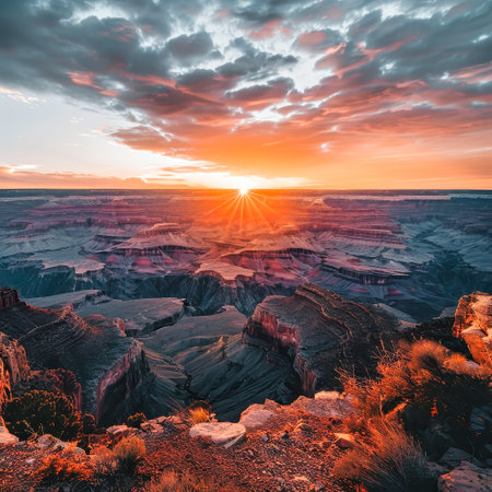 sunrise over grand canyon in vibrant colors casting light on overhanging rock formations