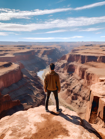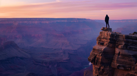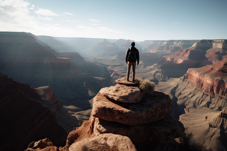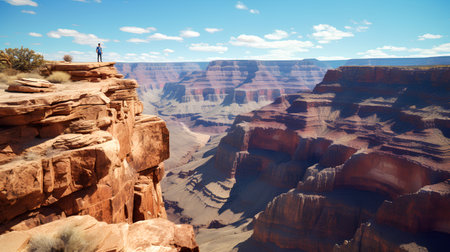 An AI generated illustration of A man standing on a tall and imposing cliff overlooking the grand canyon