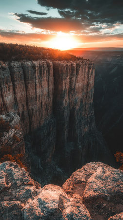 Generative AI Towering canyon walls, drone's perspective, sun on horizon, breathtaking vistas, immersive and detailed sunset over the Grand Canyon