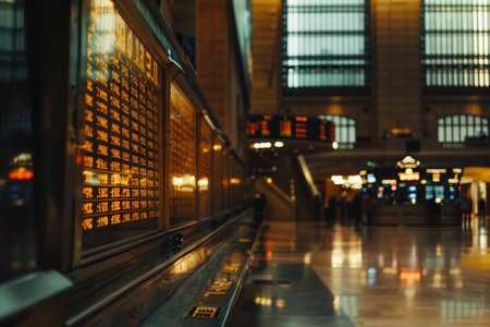 Individuals are seen moving within a spacious transit hub. The scene features arched windows, and warm interior lighting contrasted with the cool exterior hues of dusk. This composition conveys a sense of activity and transition. Potential uses include editorial illustrations, or concepts about journeys.