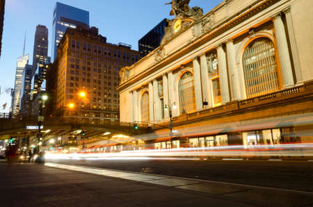 New York City, USA - August 1, 2018: Facade of the Grand Central Terminal, commuter rail terminal, at night with the Chrysler and MetLife Building in the background located in Midtown Manhattan, New York City, USA