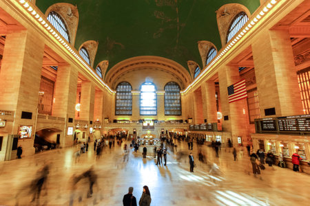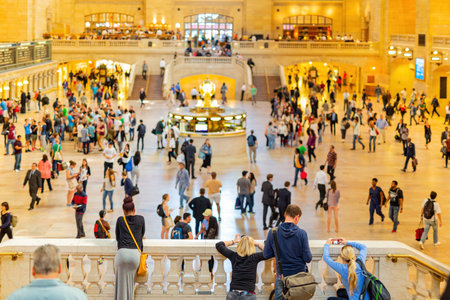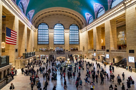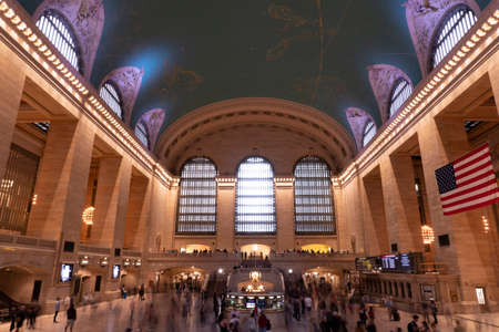 NEW YORK, APRIL 19, 2019: Commuters and tourists in the grand central station in April 19, 2019 in New York, panoramic view. It is the largest train station in the world by number of platforms: 44